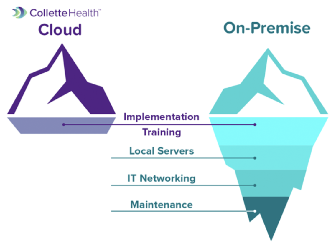 Cloud-based architectures are maintained by providers, like Collette Health, offering subscription-based services with easy scalability and high-level security. In contrast, on-premise architectures require healthcare facilities to manage and maintain their own infrastructure, leading to higher upfront and ongoing costs while increasing resource demands on internal IT teams.